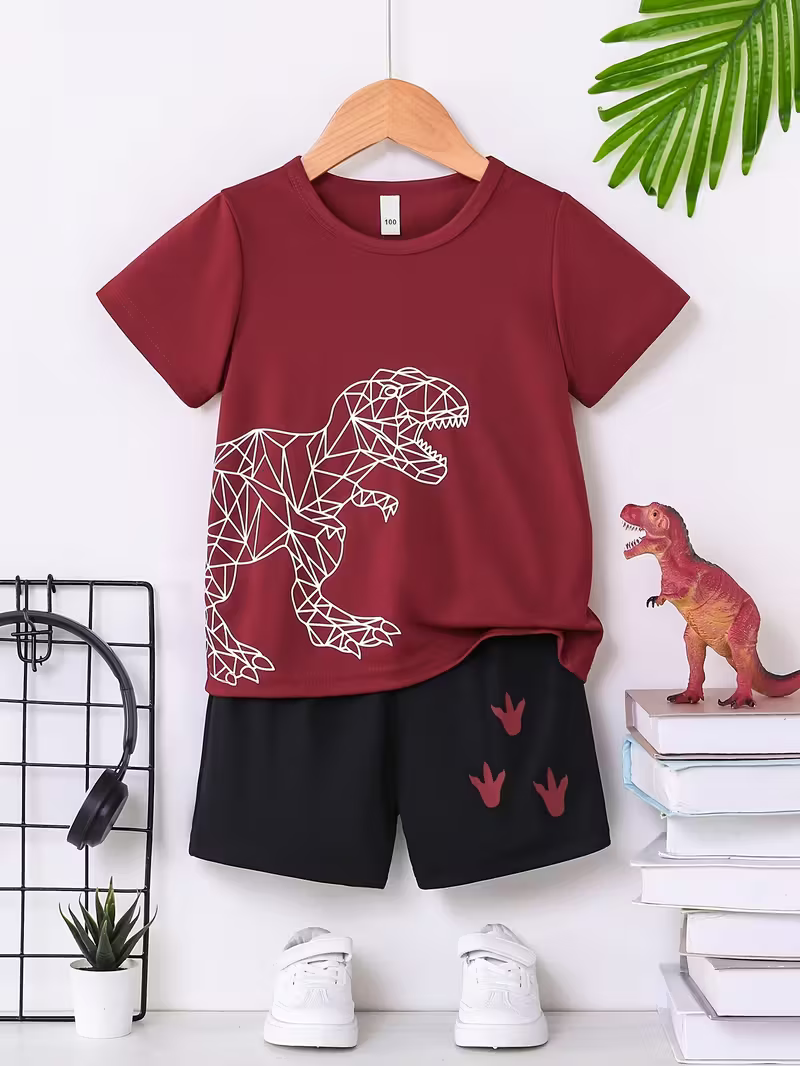 • T-Shirt Design: Plain color with cartoon dinosaur print