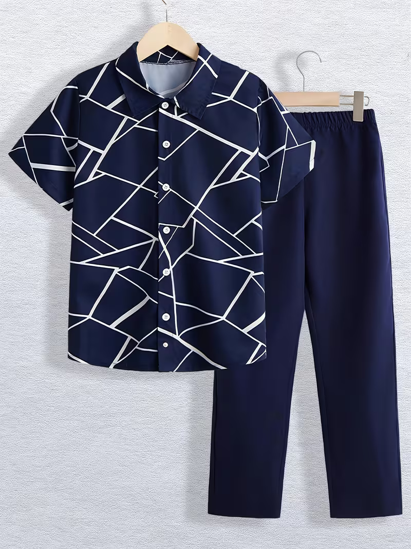 Boys’ Short Sleeve Shirt Top + Versatile Solid Color Long Two-Piece Set